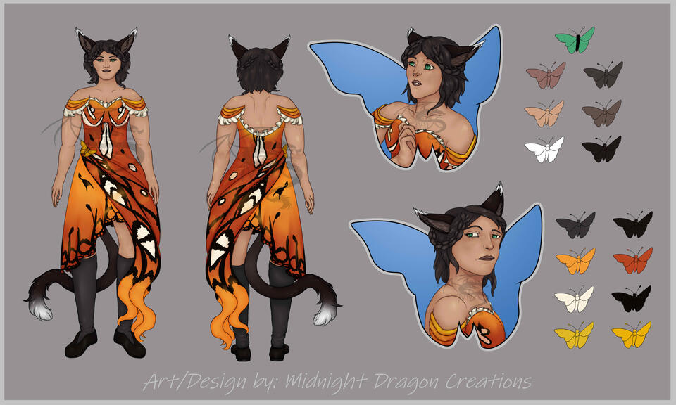 A butterfly themed cat girl vtuber design adopt. This art can be used as a character sheet. You will receive a full shaded version and a flat colored version of this sheet. Now includes an eye banner and a full static pngtuber with 3 expressions; not amused/annoyed, sad, and scared/shocked. Pngtuber model is set up to be used in veadotube mini.
